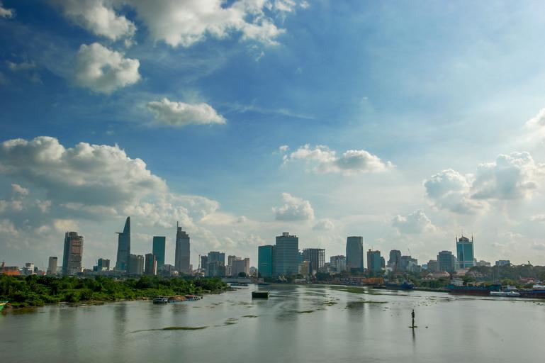 Keywords: city cloudy sky building river shadow blue ho chi minh city landscape reflection outdoors clouds light water landmark national