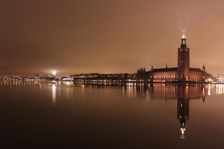 Keywords: city hall stockholm sweden night reflection water architecture illumination landmark cityscape urban swedish capital landscape outdoor sea skyline panorama tourism scandinavia building view tower