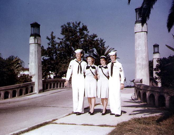 | Keywords: CityParkNewOrleansAtLiberty1944.jpg A Sunny Afternoon Stroll Sailors and WAVEs in New Orleans 1944 Personnel from Naval Air Station New Orleans Louisiana on liberty in a Public Park They are from left to right Signalman 2nd Class Harold Howey; Aviation Machinist's Mate 2nd Class Evalyne Olsen; Pharmacist's Mate 3rd Class Anna Welsh; and Pharmacist's Mate 1st Class Jackie Welsh Photographed prior to December 1944 Note Location appears to be in City Park at bridge behind the Delgado Museum now NOMA with the old Casino Building seen in background at left Official U S Navy Photograph now in the collections of the National Archives Online at http //www history navy mil/photos/images/k14000/k14393c htm 1944 before December Unnamed U S Navy photographer PD-USGov-Navy 1944 in New Orleans Dreyfous Bridge New Orleans World War II color photographs of the US Homefront People of the United States Navy |
