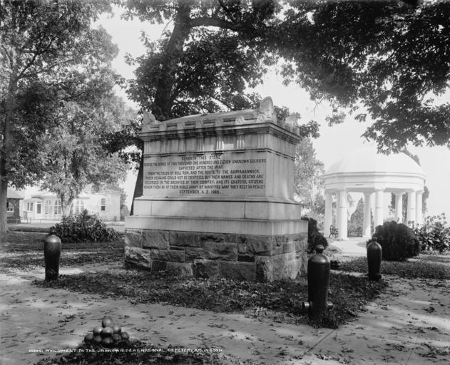 | Keywords: Civil War Unknowns Monument - Arlington National Cemetery - c 1900.jpg LargeImage en Looking northeast at the western and southern facades of the Civil War Unknowns Monument located on the grounds of Arlington House the Robert E Lee National Memorial at Arlington National Cemetery in Arlington County Virginia United States The image shows the monument circa 1900 after several changes were made to it The Rodman guns were formerly mounted on caissons and pointed outward from each corner; now they are muzzle-down in the earth The former simple lid has been removed and a new lid modeled on the Ark of the Covenant as described in the Book of Exodus in the Hebrew Bible has been added The pyramid of artillery shot which formerly sat on top of the lid has been moved to the ground Arlington House can be seen to the left along with the South Slave Quarters The dome-like structure in the flower garden behind the Civil War Unknowns Monument is the Temple of Fame This structure was erected in 1884 in the flower garden where an arbor used to be Stone columns pediments and entablatures were saved from the U S Patent Office which had suffered a serious fire several years earlier and was being demolished and were used to construct the Temple of Fame The Temple was a round Greek Revival temple-like structure with Doric columns supporting a central dome Inscribed on the pediment supporting the dome were the names of great Americans such as George Washington Ulysses S Grant Abraham Lincoln and David Farragut A year after it was built the last names of Union Civil War generals like those of George Henry Thomas George Meade James B McPherson John Sedgwick John F Reynolds Andrew A Humphreys James A Garfield and Joseph K Mansfield were carved into its columns Since there wasn't enough marble to rebuild the dome a tin dome molded and painted to look like marble was installed instead http //www loc gov/pictures/item/det1994000570/PP/ Detroit Publishing Co 1900 PD-Detroit Civil War Unknowns Monument Memorials of the American Civil War Black and white photographs John Sedgwick |
