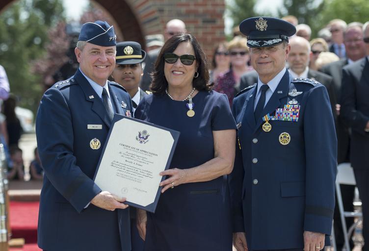 Keywords: CJCS retires TRANSCOM Commander 140505-D-KC128-283.jpg en From left Chief of Staff of the U S Air Force Gen Mark A Welsh III presents an award to Beverly Fraser the wife of Gen William M Fraser III during her husband s change of command and retirement ceremony May 5 2014 at Scott Air Force Base Ill Fraser served as the commander of U S Transportation Command before retiring from the Air Force after 40 years of service DoD photo by Mass Communication Specialist 1st Class Daniel Hinton U S Navy/Released 2014-05-05 Petty Officer 1st Class Daniel Hinton https //www dvidshub net/image/1320820 140505-D-KC128-283 2014-05-07 10 05 SCOTT AIR FORCE BASE IL US PD-USGov Mark A Welsh III Scott Air Force Base Images from DoD uploaded by Fæ |