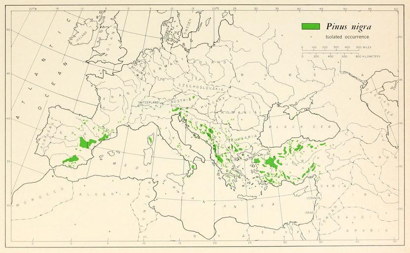 | Keywords: CL-27 Pinus nigra range map.png en Map 27 Pinus nigra distribution 1966-02 http //www biodiversitylibrary org/bibliography/66393 /summary Geographic distribution of the pines of the world Miscellaneous publication no 991 U S Department of Agriculture Forest Service Washington D C February 1966 William B Critchfield Elbert L Little Jr U S Department of Agriculture Forest Service PD-USGov Uploaded with UploadWizard Geographic Distribution of the Pines of the World Pinus nigra range maps | ||||