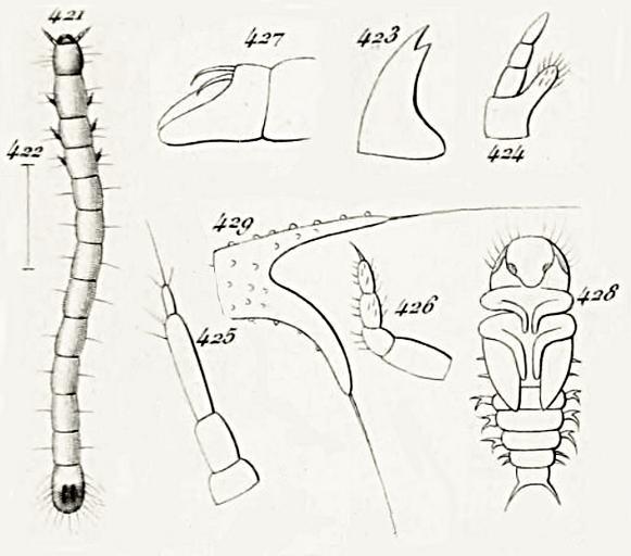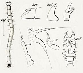 Keywords: Clamoris crenata larva.png de aus Perris Histoire des insectes du pin maritime Paris 1863 Tafel 4 1857 Larve und Puppe mit DEtails von Clamoris crenata<br>421 Larve 423 Oberkiefer von oben 424 Unterkiefer mit Kiefertaster 425 Fühler 426 Bein 427 Abdomen 428 Puppe 429 Papille an der Seite der Abdominalsegmente Perris Histoire des insectes du pin maritime Paris 1863 Tafel 4 Fig 421-429 1857 1875 PD-old Clamoris crenata