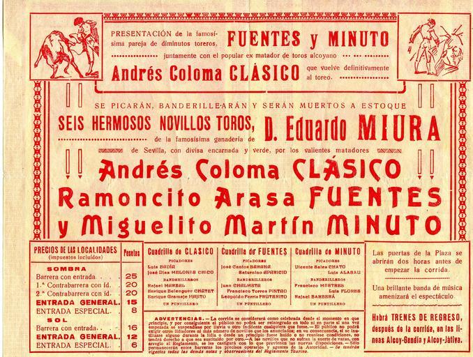 | Keywords: Clásico últim cartell.jpg en Poster of the last appearance as a bullfighter of Andrés Coloma Sanjuán Clásico matador from Alcoi Alcoi 16th April 1944 ca Cartell de l'última aparició de Clásico vestint el trage de llums Alcoi 16 d'abril de 1944 own - digitalització d'un cartell públic propietat de l'autor Original i il·lustracions anònimes OvidiCarbonell 16 d'abril de 1944 Check categories 2009 October 29 ca wikipedia Andrés_Coloma Alcoi 3 Alcoi Bullfighting posters People of the Land of Valencia 1944 in Spain 1944-04-16 |