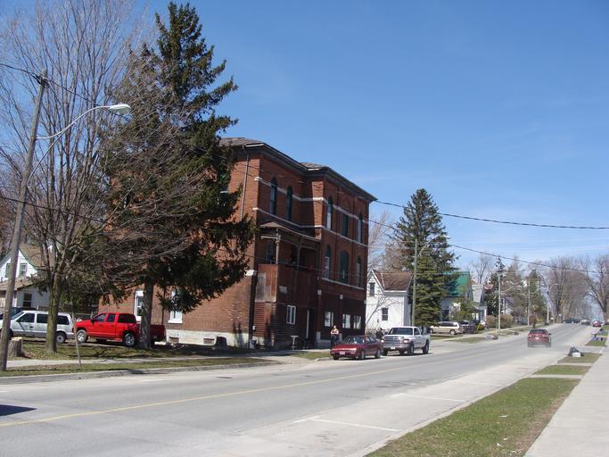 | Keywords: clement block clementblock brick freemasons george clement georgeclement fire escape fireescape outdoor road View of block on corner of St. George and Thomas Streets from the south-east. This building was designed and constructed by George Clement in 1892. An article in the town's newspaper of the time, The Tribune, dated December 16, 1892, describes the building as 'an ornament to the town'. It originally housed shops, a doctor's rooms and the Deseronto Club. The top floor was occupied by the Masonic fraternity. View of block on corner of St. George and Thomas Streets from the south-east. This building was designed and constructed by George Clement in 1892. An article in the town's newspaper of the time, The Tribune, dated December 16, 1892, describes the building as 'an ornament to the town'. It originally housed shops, a doctor's rooms and the Deseronto Club. The top floor was occupied by the Masonic fraternity. |