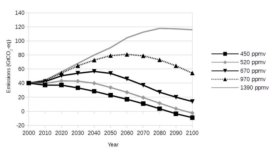| Keywords: Climate change mitigation scenarios (IIASA). Global greenhouse gas emissions 2000-2100.png greenhouse gas GHG emissions between the years 2000 and 2100 for a range of climate change mitigation scenarios Emissions are measured in billion tonnes of carbon dioxide-equivalent GtCO<sub>2</sub>-eq Projections for 5 scenarios are shown Each scenario is designed to stabilize atmospheric GHG concentrations at a different level 450 520 670 970 and 1390 ppmv A summary table of the graph data is given in a later section In the scenarios global emissions peak then decline Emissions peak sooner in the century for the lower stabilization scenarios References The full set of emissions data can be freely downloaded from International Institute for Applied System Analysis IIASA http //www iiasa ac at/web-apps/ggi/GgiDb/dsd Action htmlpage page about GGI Scenario Database Ver 2 0 2009 Archived https //web archive org/web/20131004192147/http //www iiasa ac at/web-apps/ggi/GgiDb/dsd Action htmlpage page about 4 October 2013 These are the A2r mitigation scenarios The global warming potentials used for the non-CO<sub>2</sub> greenhouse gases are 21 CH<sub>4</sub> 310 N<sub>2</sub>O 6500 PFC 23900 SF<sub>6</sub> and 1300 HFC 2014-10-29 08 35 08 own Enescot other versions Data Decade when global emissions peak wikitable sortable - Scenario Peaking<br/>decade - 450 ppmv 2000 - 520 ppmv 2020 - 670 ppmv 2040 - 970 ppmv 2060 - 1390 ppmv 2080 Annual emissions GtCO<sub>2</sub>-eq 2000 to 2100 wikitable sortable - Scenario Year<br/>2000 2030 2050 2100 - 450 ppmv 40 1 33 3 22 8 -8 9 - 520 ppmv 40 1 42 9 33 8 -2 5 - 670 ppmv 40 1 54 1 53 9 13 9 - 970 ppmv 40 1 64 7 79 2 54 3 - 1390 ppmv 40 1 68 1 90 5 115 9 cc-zero Uploaded with UploadWizard Greenhouse emissions |