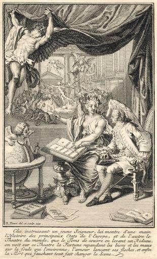 Keywords: Clio-time-love-fortune-death-picart-1731.jpg en Clio the muse of history instructs a young nobleman The lessons are revealed by Time who pulls back a curtain to show a theater of the past The principals in that scene Love Fortune and Death spread their favors with abandon The image was used as the frontispiece to a 1732 edition of Samuel Pufendorf's Introduction à l'histoire générale et politique de l'univers St John's Univ http //cdm csbsju edu/cdm/ref/collection/ArcaArt/id/9115 Bernard Picart 1731 PD-old-100 PD-1996 Clio Father Time Cupido Fortuna Allegories of death |