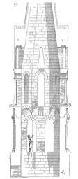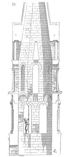 Keywords: Clocher.Vernouillet.3.png Les clochers centrals du XII<sup>e</sup> siècle sont fort rares dans cette partie de la France dévastée par les guerres de la fin de ce siècle; aussi celui de Vernouillet qui clôt l'époque de transition doit-il être étudié avec attention Il se compose d'une base carrée sans ouverture portant sur les quatre piles de la croisée et sur les quatre arcs doubleaux Le beffroi à jour s'élève sur ce socle; ses angles sont renforcés de colonnes engagées formant contreforts; les quatre faces sont percées chacune de deux baies Viollet-le-Duc Bell Tower Viollet-le-Duc Église Saint-Étienne de Vernouillet |