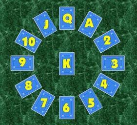 | Keywords: Clock Solitaire.JPG  This is a diagram of the solitaire game of Clock Solitaire based on a simulated layout The image is made in Microsoft Powerpoint and the cards used were based on the SVG Playing Cards own 2006-05-03 Nanami Kamimura I made this myself you can download it as long as you like Solitaire |