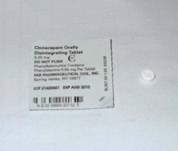 Keywords: ClonazepamODT.jpg en clonazepam orally disintegrating tablet 0 25mg Own Twirligig 01/09/2008 Clonazepam White pills Pills on tables Benzodiazepine pills