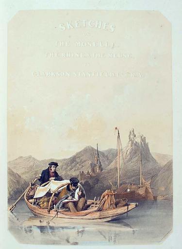 Keywords: Clotten on the Moselle.jpg en Klotten on the Moselle; the artist draw himself in the boat in the foreground de Klotten an der Mosel; der Künstler malte sich selbst im Boot im Vordergrund fr Klotten sur la Moselle; l'artiste a dessiné lui-même dans le bateau au premier plan 1838 http //www dilibri de/rlb/content/pageview/1280 creator Clarkson Stanfield PD-old-100 William Clarkson Stanfield Sketches on the Moselle the Rhine and the Meuse 1838 Burg Coraidelstein Moselle River in Landkreis Cochem-Zell Klotten
