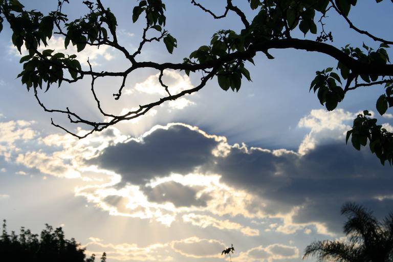 Keywords: clouds dark edged light shiny bright sky blue sunset tree branch