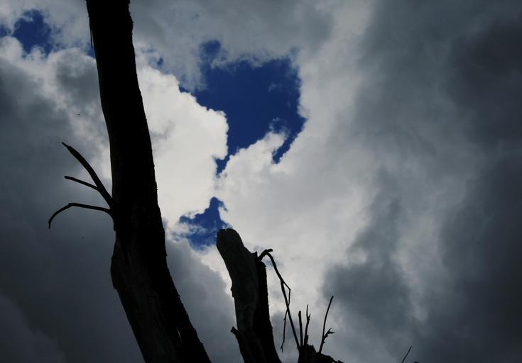Keywords: clouds white shades of shadow blue sky closing in storm buiding up tree trunk