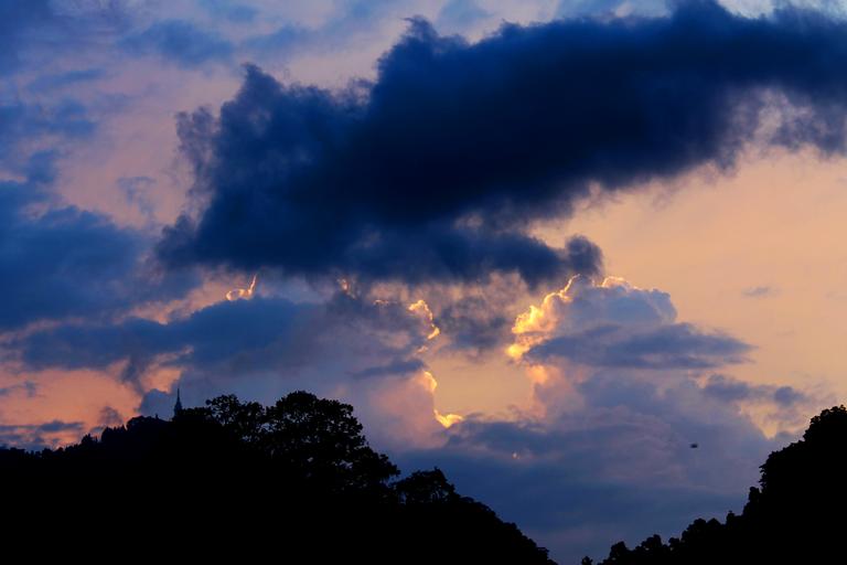 Keywords: cloudy dark sunsets evening dusk silhouettes trees plants flora branches leaves deep blue clouds twilight orange lights sky dramatic scenic scenery landscapes skies darkness moody atmosphere