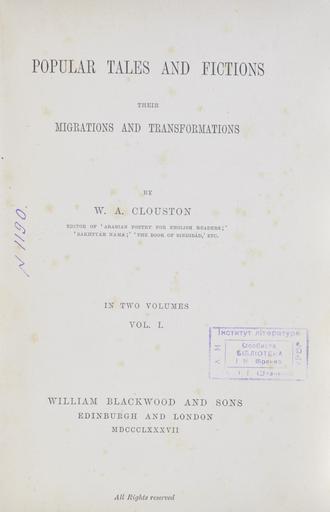 Keywords: Clouston Popular Tales and Fictions 1408.jpg William Alexander Clouston Popular Tales and Fictions Единбу ґ Лондон 1887 Титульний а куш З особистої бібліотеки І Ф анка 1887 Institution Shevchenko Institute of Literature Digital Collection PD-old-70-1923 1790 books from Germany Franko Personal Library Collections of books in libraries in Ukraine Shevchenko Institute of Literature Uploaded with VicuñaUploader |