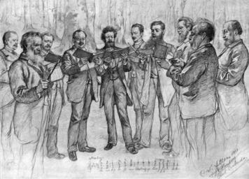 | Keywords: Club 25 Chor.jpg en Choir singing a text by Joseph von Eichendorff Wer hat dich du schöner Wald de Laienchor sing Wer hat dich du schöner Wald aufgebaut so hoch da droben Buch Club Eintracht Creator Christian Wilhelm Allers 1888 PD-old-auto-1923 1915 Club Eintracht Choirs in art |