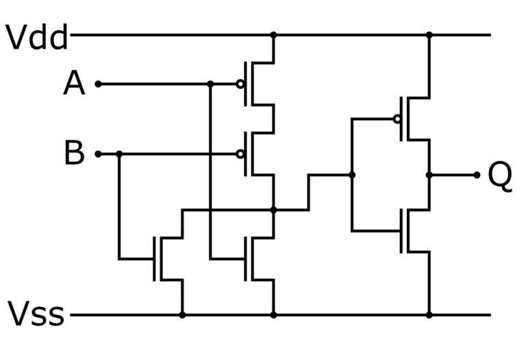 Keywords: CMOS OR.svg ValidSVG made with Inkscape Layout of NMOS and PMOS components in an OR Gate This OR gate is implemented as an AND gate with both inputs inverted by using PMOS at the top as well as the otutput inverter at the right which is functionally correct but is not commonly used as it requires 2 extra transistors Own drawing Inkscape 0 43 12/07/06 inductiveload PD CMOS