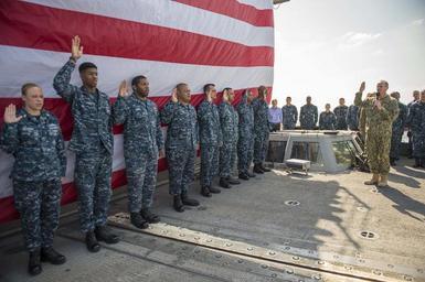 Keywords: CNO visits sailors 131128-N-WL435-107.jpg en Chief of Naval Operations Adm Jonathan Greenert and Master Chief Petty Officer of the Navy Mike Stevens re-enlist sailors aboard the guided-missile cruiser USS Gettysburg CG 64 during a visit where the two had lunch and held an all-hands call on Thanksgiving Day Greenert and Stevens wanted to spend time with members of their Navy-Marine Corps family during the Thanksgiving holiday period to show their support and appreciation for the many men and women who serve in the military U S Navy photo by Chief Mass Communication Specialist Peter D Lawlor/Released 2013-11-28 Petty Officer 1st Class Peter Lawlor https //www dvidshub net/image/1064370 131128-N-WL435-107 2013-12-02 23 17 GULF OF OMAN AT SEA PD-USGov-Military-Navy Jonathan W Greenert in 2013 USS Gettysburg CG-64 Images from DoD uploaded by Fæ |