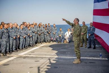 Keywords: CNO visits sailors 131128-N-WL435-256.jpg en Chief of Naval Operations Adm Jonathan Greenert and Master Chief Petty Officer of the Navy Mike Stevens meet with sailors aboard the guided-missile cruiser USS Gettysburg CG 64 for lunch and an all-hands call on Thanksgiving Day Greenert and Stevens wanted to spend time with members of their Navy-Marine Corps family during the Thanksgiving holiday period to show their support and appreciation for the many men and women who serve in the military U S Navy photo by Chief Mass Communication Specialist Peter D Lawlor/Released 2013-11-28 Petty Officer 1st Class Peter Lawlor https //www dvidshub net/image/1064371 131128-N-WL435-256 2013-12-02 23 17 GULF OF OMAN AT SEA PD-USGov-Military-Navy Jonathan W Greenert in 2013 USS Gettysburg CG-64 Images from DoD uploaded by Fæ |