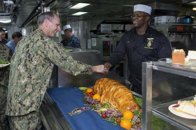 Keywords: CNO visits sailors 131128-N-WL435-555.jpg en Chief of Naval Operations Adm Jonathan Greenert has lunch with sailors aboard the guided-missile cruiser USS Gettysburg CG 64 after an all-hands call with Master Chief Petty Officer of the Navy Mike Stevens on Thanksgiving Day Greenert and Stevens wanted to spend time with members of their Navy-Marine Corps family during the Thanksgiving holiday period to show their support and appreciation for the many men and women who serve in the military U S Navy photo by Chief Mass Communication Specialist Peter D Lawlor/Released 2013-11-28 Petty Officer 1st Class Peter Lawlor https //www dvidshub net/image/1064375 131128-N-WL435-555 2013-12-02 23 17 GULF OF OMAN AT SEA PD-USGov-Military-Navy Jonathan W Greenert in 2013 USS Gettysburg CG-64 Images from DoD uploaded by Fæ |