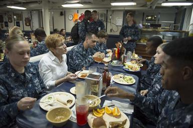 Keywords: CNO visits sailors 131128-N-WL435-559.jpg en Darleen Greenert wife of Chief of Naval Operations Adm Jonathan Greenert has lunch with sailors aboard the guided-missile cruiser USS Gettysburg CG 64 on Thanksgiving Day Adm Greenert Mrs Greenert and Master Chief Petty Officer of the Navy Mike Stevens wanted to spend time with members of their Navy-Marine Corps family during the Thanksgiving holiday period to show their support and appreciation for the many men and women who serve in the military U S Navy photo by Chief Mass Communication Specialist Peter D Lawlor/Released 2013-11-28 Petty Officer 1st Class Peter Lawlor https //www dvidshub net/image/1064376 131128-N-WL435-559 2013-12-02 23 17 GULF OF OMAN AT SEA PD-USGov-Military-Navy Jonathan W Greenert in 2013 USS Gettysburg CG-64 Images from DoD uploaded by Fæ |