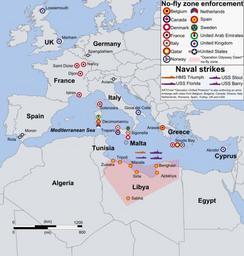 | Keywords: Coalition action against Libya-en.svg coalition intervention in Libya File A large blank world map with oceans marked in blue svg for blank map <br> File RAF roundel svg<br> File RCAF-Roundel svg<br> File French-roundel svg<br> File Royal Danish Air Force Roundel svg<br> File Roundel of the USAF svg<br> File Roundel of Qatar svg<br> File Roundel of the Italian Air Force svg<br> File Roundel of the Spanish Air Force svg<br> File Royal Norwegian Air Force Roundel svg<br> File Roundel of the Belgian Air Force svg<br> File Graney class SSN svg<br> File Burke class destroyer profile;wpe47485 gif<br> File Arab Emirates AF roundel svg<br> File Netherlands roundel svg<br> File Operation Odyssey Dawn - No Fly Zone - Libya March 2011 jpg for no-fly zone outline Jolly Janner 2011-03-21 Coalicion contra Gadafi 2011 svg Coalition action against Libya-ItalianNavyAdded svg Coalition action against Libya Other fields + 47 < Maps Cc-zero 2011 military intervention in Libya Maps of the 2011 Libyan civil war SVG maps in English |
