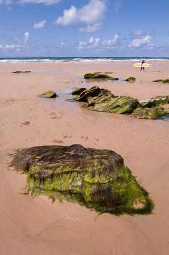 Keywords: coast beach stones sea seaweed surfer surfboard water sky landscape nature clouds lake wave idyll mirroring atlantic sand beach leisure holiday holidays recovery