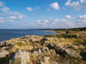 Keywords: coast rock sea water rocky coast baltic sea blue sky clouds denmark landscape