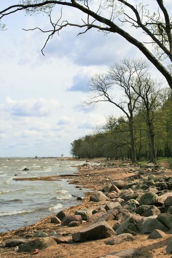 Keywords: coast shore beach sea rocks sand trees peterhof