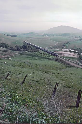 Keywords: amtrak outdoor landscape grassland field hill Roger Puta located himself on the inside of the upper leg of the horseshoe curve above San Luis Obispo one day in March 1985. He shot a freight train, which I'll post and the Coast Starlight, both uphill trains. Amtrak 292 and a sister F40PH were in charge of the Coast Starlight that day. First he caught it on the trestle on the end of the lower leg of the horseshoe a little north of San Louis Obispo. Then he squeezed off three shots after it rounded the curve and was climbing toward him. It's all up hill since before the trestle and well beyond where he was standing. Roger Puta located himself on the inside of the upper leg of the horseshoe curve above San Luis Obispo one day in March 1985. He shot a freight train, which I'll post and the Coast Starlight, both uphill trains. Amtrak 292 and a sister F40PH were in charge of the Coast Starlight that day. First he caught it on the trestle on the end of the lower leg of the horseshoe a little north of San Louis Obispo. Then he squeezed off three shots after it rounded the curve and was climbing toward him. It's all up hill since before the trestle and well beyond where he was standing. Roger Puta located himself on the inside of the upper leg of the horseshoe curve above San Luis Obispo one day in March 1985. He shot a freight train, which I'll post and the Coast Starlight, both uphill trains.