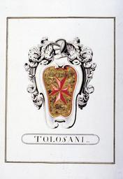 | Keywords: Coat of arms Tolosani family Tuscany.jpg en Coat of Arms of Tolosani tuscan family from Colle Val d'Elsa Siena http //www archiviodistato firenze it/ceramellipapiani/servlet/action navigate Dettagli idFam 7400 State Archive of Florence century 19 Coats of arms of families of Italy PD-old |