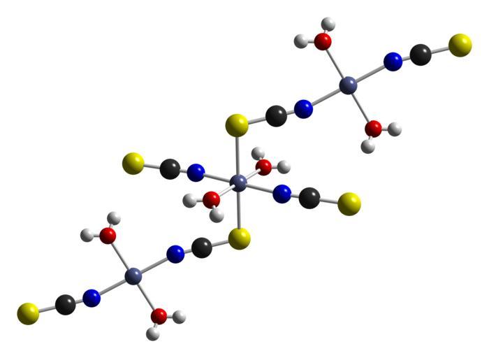 | Keywords: Cobalt(II)-thiocyanate-trihydrate-xtal-1976-Co-coordination-CM-3D-balls.png Ball-and-stick diagram of the coordination geometry and environment of cobalt in the crystal structure of cobalt II thiocyanate trihydrate Co NCS <sub>2</sub>·3H<sub>2</sub>O better described as trans- H<sub>2</sub>O <sub>2</sub>Co NCS <sub>2</sub>·H<sub>2</sub>O Colour code Cobalt Co grey-blue Nitrogen N blue Carbon C black Sulfur S yellow Oxygen O red Hydrogen H white Crystal structure from http //dx doi org/10 1107/S0567740876005694 Acta Cryst 1976 B32 1526-1529 Image generated in http //www crystalmaker com/ CrystalMaker 8 3 Own 2010-08-09 Ben Mills Benjah-bmm27 Images by Ben Mills Ball-and-stick models Cobalt II thiocyanate |