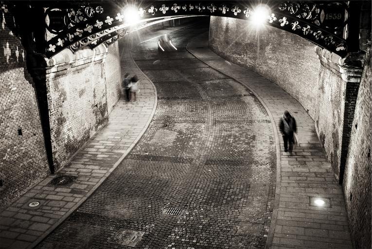 Keywords: cobblestone street road sidewalk stones people pedestrians walking night dark evening bridge architecture town city