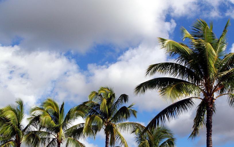 Keywords: coconut trees blue sky tropical paradise clouds sunny tree hawaiian