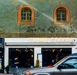 Keywords: coffee coffee shop cafe shop business person restaurant man drink break adult building car windows high street street walking flowers sign