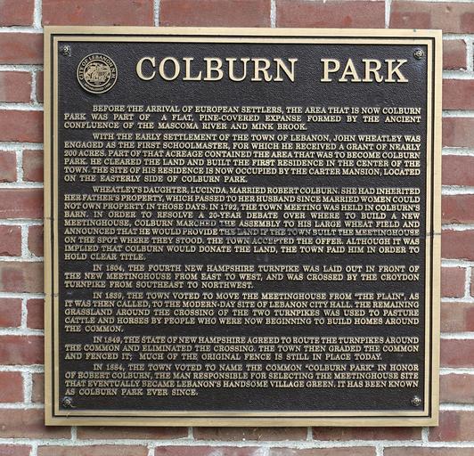 Keywords: Colburn Park plaque - Lebanon, NH - DSC02635.JPG en Lebanon New Hampshire USA 2015-09-12 15 45 33 own Daderot other versions cc-zero Colburn Park Uploaded with UploadWizard
