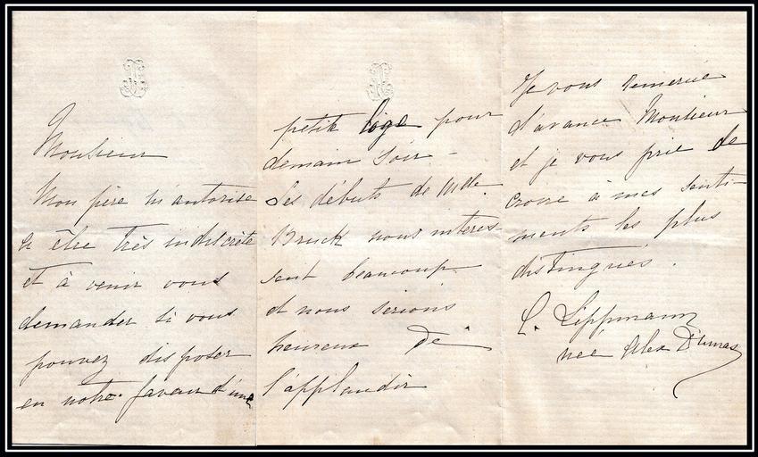 | Keywords: Colett Dumas letter.jpg ru Письмо Колетт Дюма с п осбой п едоставить ложе теат а ей и ее отцу - Александ у Дюма сыну 2015-08-07 Письмо Колетт Дюма о посещении теат а с отцом Александ ом Дюма сыном Колетт Дюма other versions PD-old-70-1923 Uploaded with UploadWizard Colette Dumas |