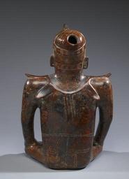 Keywords: Colima - Seated Male - Walters 20092013 - Back.jpg This figure-as-vessel features a seated male of commanding presence The dark red-slipped figure portrays a man with confident visage in a straightforward commanding seated position His hornlike protrusion is tied to his head with embellished embroidered cloth straps and his hip wrap is equally well decorated He also sports an elaborate necklace of large shells The horned element atop the figure's forehead suggests other interpretations particularly that of a shaman and his supernatural horn The shaman would use the horn to battle malevolent spiritual forces the horn also symbolizing his tonally vital essence and spirit power An alternative interpretation views the hornlike element as a symbol of social hierarchy and rulership sacrifice and cosmic geography and the earth's fertility It represents a prong cut from a conch shell that throughout Mesoamerica was associated with rituals of sacrifice and warfare and also expressed political rank As such the figure may be understood as portraying a person of social and political authority based on religious ideology 100 BC-AD 300 Comala Phase earthenware burnished slip paint in red and light brown with incising cm 43 4 29 1 23 2 accession number 2009 20 13 80168 Stendahl Galleries Los Angeles date and mode of acquisition unknown John G Bourne 1990s by purchase Walters Art Museum Gift of John Bourne 2009 place of origin Colima Mexico Walters Art Museum license Objects from Colima in the Walters Art Museum Media contributed by the Walters Art Museum needs category review