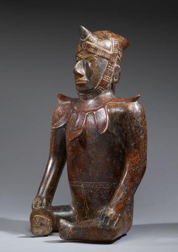 Keywords: Colima - Seated Male - Walters 20092013 - Three Quarter Left.jpg This figure-as-vessel features a seated male of commanding presence The dark red-slipped figure portrays a man with confident visage in a straightforward commanding seated position His hornlike protrusion is tied to his head with embellished embroidered cloth straps and his hip wrap is equally well decorated He also sports an elaborate necklace of large shells The horned element atop the figure's forehead suggests other interpretations particularly that of a shaman and his supernatural horn The shaman would use the horn to battle malevolent spiritual forces the horn also symbolizing his tonally vital essence and spirit power An alternative interpretation views the hornlike element as a symbol of social hierarchy and rulership sacrifice and cosmic geography and the earth's fertility It represents a prong cut from a conch shell that throughout Mesoamerica was associated with rituals of sacrifice and warfare and also expressed political rank As such the figure may be understood as portraying a person of social and political authority based on religious ideology 100 BC-AD 300 Comala Phase earthenware burnished slip paint in red and light brown with incising cm 43 4 29 1 23 2 accession number 2009 20 13 80168 Stendahl Galleries Los Angeles date and mode of acquisition unknown John G Bourne 1990s by purchase Walters Art Museum Gift of John Bourne 2009 place of origin Colima Mexico Walters Art Museum license Objects from Colima in the Walters Art Museum Media contributed by the Walters Art Museum needs category review