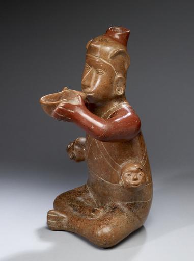 Keywords: Colima - Seated Male with Trophy Heads - Walters 20092010 - Three Quarter Left.jpg This figure-as-vessel features a seated male of commanding presence The sculptor painted the jar's orifice and the man's arms with dark red slip to contrast with the piece's otherwise orange-red coloration The figure's loins are covered by the typical male hip cloth indicated here by incised lines He holds a gourd-shaped bowl to his mouth ready to drink its contents perhaps a chocolate or alcoholic beverage A helmetlike head covering includes an arched element above each ear and a hornlike protrusion at the front The sculpture might portray a warrior implied by the two trophy heads slung across his chest and hanging at his sides The horned element atop the figure's forehead suggests other interpretations particularly that of a shaman and his supernatural horn The shaman would use the horn to battle malevolent spiritual forces the horn also symbolizing his tonally vital essence and spirit power An alternative interpretation views the hornlike element as a symbol of social hierarchy and rulership sacrifice and cosmic geography and the earth's fertility It represents a prong cut from a conch shell that throughout Mesoamerica was associated with rituals of sacrifice and warfare and also expressed political rank As such the figure may be understood as portraying a person of social and political authority based on religious ideology This latter interpretation is supported by the feasting implication of the figure holding the gourd-shaped bowl feasting being an integral part of elite activities throughout the ancient Americas 100 BC-AD 300 Comala Phase earthenware burnished slip paint in red and light brown with incising cm 43 6 25 27 2 accession number 2009 20 10 80165 Michael Robins date and mode of acquisition unknown John G Bourne date and mode of acquisition unknown Walters Art Museum Gift of John Bourne 2009 place of origin Colima Mexico Walters Art Museum license Objects from Colima in the Walters Art Museum Media contributed by the Walters Art Museum needs category review Colima ceramic figurines