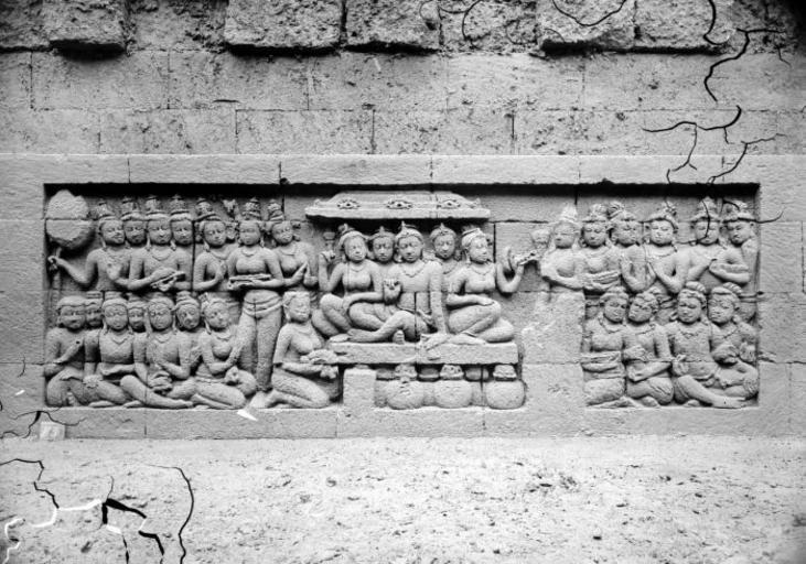 | Keywords: COLLECTIE TROPENMUSEUM Reliëf O 139 op de verborgen voet van de Borobudur TMnr 10015876.jpg nl Negatief Negatief waarop reliëf O 139 van de verborgen voet van de Borobudur te zien is De verborgen voet van de Borobudur is de oorspronkelijke basis van het Buddhistische heiligdom dat rond 800 gebouwd is In een latere fase van de bouw werd deze basis verborgen waarschijnlijk om verzakking te verkomen De verborgen voet loopt om het hele bouwwerk heen en bevat 160 reliëfs die tezamen de Mahakarmawibhangga verbeelden een Mahayanistische tekst die de werking van de leer van Karma uiteenzet Deze leerrede wordt aan Buddha toegeschreven en handelt over oorzaak en gevolg N J Krom en Th van Erp duiden in hun standaardwerk over de Borobudur Beschrijving van Barabudur Den Haag Martinus Nijhoff 1920-1931 de reliëfs van de verborgen voet aan als serie O Op de reliëfs zijn voorbeelden van de theorie uitgebeeld goede daden hebben goede gevolgen en slechte daden hebben slechte gevolgen De reliëfs vallen in twee delen uiteen O 1 tot en met O 117 verbeelden een aantal daden die leiden tot één en hetzelfde gevolg De reliëfs O 118 tot en met O 160 tonen verschillende gevolgen van één oorzaak De uiteenzetting van de leer begint bij de trap aan de oostzijde en ontrolt zich met de klok mee om het bouwwerk heen De reliëfs moeten dan ook gelezen worden van rechts naar links Lange tijd was onbekend wat op de reliëfs van de verborgen voet stond afgebeeld Hoewel de reliëfs al in 1885 waren ontdekt door Dr Ir J W IJzerman 1851-1932 kon de Franse geleerde Sylvain Lévi pas in 1929 op het zesde Congres van het Oostersch Genootschap constateren dat het op de verborgen voet ging om een Buddhistische tekst Mahakarmawibhangga Lévi had in 1922 een manuscript uit 1411 met deze tekst ontdekt in Kathmandu Nepal De tekst bleek populair in de Burdhistische wereld te zijn en een aantal verwante teksten te hebben twee Chinese werken waarvan één vertaald was in 582 door Gautama Dharmaprajna en één tussen 980 en 1000 door T'ien si Tsai Daarnaast bevat de Tibetaanse Kanjur twee werken met de titel Karmawibhangga In 1933 publiceerde de archeoloog N J Krom een uitgebreide analyse van het Mahakarmawibhangga op de reliëfs van de bedolven voet Hierin legt hij een relatie tussen de afbeeldingen op de reliëfs en de tekstpassages in het Mahakarmawibhangga Reliëf O 139 bevindt zich aan de noordzijde van de Borobudur en heeft volgens N J Krom betrekking op paragraaf 68 van het Mahakarmawibhangga LXVIII Welke zijn de tien voordelen van de gift van vaatwerk Antwoord men wordt een vat van deugden; men wordt glad van denkvermogen; men lijdt niet veel dorst; als men dorst heeft verschijnt er water; men wordt niet herboren bij preta's; men heeft nooit gebrek aan vaatwerk; men heeft een rijke positie; men wordt herboren in de hemels; men bereikt spoedig het Parinirwana Dit zijn de tien voordelen van de gift van vaatwerk Deze paragraaf heeft betrekking op reliëfs O 138 tot en met O 140 Boven O 138a staat een inscriptie waarvan slechts het einde te lezen is 'dana' Op het reliëf staan staande en knielende personen afgebeeld die schalen aanbieden aan drie personen onder een afdak Op het volgende tafereel op O 138b bezoeken vier mannen vier hoger geplaatste monniken Hier staat de inscriptie 'kusaladharmabhajana' vaten van voortreffelijke eigenschappen wat overeenkomt met de vaten van deugden in de tekst Reliëf O 139 bevat één tafereel van een rijke man met kostbaarheden onder zijn zetel en zijn talrijke gevolg De inscriptie luidt 'bhogi' rijk gefortuneerd Op O 140a zien we een aanzienlijke rijke man met zijn vrouwen in een paviljoen Op O 140b zien we een rijke man naast een heiligdom De inscriptie 'swargga' geeft aan dat het om een hemel gaat ook al ontbreken hier de hemelboom de juwelenpotten en de kinnara's half mens half vogel die normaliter een hemel aanduiden Uit N J Krom Het Karmawibhangga op Barabudur Mededeelingen der koninklijke academie van wetenschappen afdeeling letterkunde deel 76 serie B No 8 Amsterdam Noordhollandsche Uitgevers-Maatschappij 1933 263-264 Bronnen A J Bernet Kempers Borobudur Mysteriegebeuren in steen Verval en restauratie Oudjavaans volksleven Wassenaar 1973/gewijzigde herdruk ; Van Erp Th Krom N J Beschrijving van Barabudur Den Haag Martinus Nijhoff 1920-1931 ; N J Krom Het Karmawibhangga op Barabudur Mededeelingen der koninklijke academie van wetenschappen afdeeling letterkunde deel 76 serie B No 8 Amsterdam Noordhollandsche Uitgevers-Maatschappij 1933 Reliëf O 139 op de verborgen voet van de Borobudur 1890-1891 institution Tropenmuseum KIT-source 10015876 Creator Kassian Cephas Borobudur in 1890 Black and white photographs |