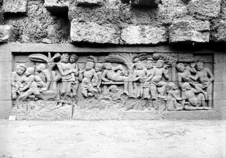 | Keywords: COLLECTIE TROPENMUSEUM Reliëf O 13 op de verborgen voet van de Borobudur TMnr 10015751.jpg nl Negatief Negatief waarop reliëf O 13 van de verborgen voet van de Borobudur te zien is De verborgen voet van de Borobudur is de oorspronkelijke basis van het Buddhistische heiligdom dat rond 800 gebouwd is In een latere fase van de bouw werd deze basis verborgen waarschijnlijk om verzakking te verkomen De verborgen voet loopt om het hele bouwwerk heen en bevat 160 reliëfs die tezamen de Mahakarmawibhangga verbeelden een Mahayanistische tekst die de werking van de leer van Karma uiteenzet Deze leerrede wordt aan Buddha toegeschreven en handelt over oorzaak en gevolg N J Krom en Th van Erp duiden in hun standaardwerk over de Borobudur Beschrijving van Barabudur Den Haag Martinus Nijhoff 1920-1931 de reliëfs van de verborgen voet aan als serie O Op de reliëfs zijn voorbeelden van de theorie uitgebeeld goede daden hebben goede gevolgen en slechte daden hebben slechte gevolgen De reliëfs vallen in twee delen uiteen O 1 tot en met O 117 verbeelden een aantal daden die leiden tot één en hetzelfde gevolg De reliëfs O 118 tot en met O 160 tonen verschillende gevolgen van één oorzaak De uiteenzetting van de leer begint bij de trap aan de oostzijde en ontrolt zich met de klok mee om het bouwwerk heen De reliëfs moeten dan ook gelezen worden van rechts naar links Lange tijd was onbekend wat op de reliëfs van de verborgen voet stond afgebeeld Hoewel de reliëfs al in 1885 waren ontdekt door Dr Ir J W IJzerman 1851-1932 kon de Franse geleerde Sylvain Lévi pas in 1929 op het zesde Congres van het Oostersch Genootschap constateren dat het op de verborgen voet ging om een Buddhistische tekst Mahakarmawibhangga Lévi had in 1922 een manuscript uit 1411 met deze tekst ontdekt in Kathmandu Nepal De tekst bleek populair in de Burdhistische wereld te zijn en een aantal verwante teksten te hebben twee Chinese werken waarvan één vertaald was in 582 door Gautama Dharmaprajna en één tussen 980 en 1000 door T'ien si Tsai Daarnaast bevat de Tibetaanse Kanjur twee werken met de titel Karmawibhangga In 1933 publiceerde de archeoloog N J Krom een uitgebreide analyse van het Mahakarmawibhangga op de reliëfs van de bedolven voet Hierin legt hij een relatie tussen de afbeeldingen op de reliëfs en de tekstpassages in het Mahakarmawibhangga Reliëf O 13 bevindt zich aan de oostzijde van de Borobudur en correspondeert volgens N J Krom met de derde paragraaf van het Mahakarmawibhangga Wat is de daad die veel pijnen ten gevolge heeft Antwoord het geven van stompen en slagen; het zich verheugen in het geven van stompen en slagen; het prijzen van het geven van stompen en slagen; er tevreden over zijn dat deze gegeven worden; het kwellen van vader en moeder naar geest en lichaam en desgelijks van anderen deugdzame zwervende geestelijken de geest te doen lijden; tevreden zijn over de ziekte van een vijand; ontevreden zijn over het herstel van een vijand; het geven van ondeugdelijke geneesmiddelen aan zieken zo ook voedsel dat niet verteert Dat is de daad die veel pijnen ten gevolge heeft Uit N J Krom Het Karmawibhangga op Barabudur Mededeelingen der koninklijke academie van wetenschappen afdeeling letterkunde deel 76 serie B No 8 Amsterdam Noordhollandsche Uitgevers-Maatschappij 1933 221 De vele pijnen zijn te zien op het linkertafereel op de reliëfs O 13 tot en met O 15 Op reliëf O 13a zijn de stompen en slagen vervangen door schoppen en duwen met het been Het slaan is afgebeeld als een slag met de vlakke hand De mensen op 13b verheugen zich in het slaan Wat de man op 13c doet is onduidelijk ook omdat het onderste deel van het reliëf is weggehakt Op 13d staat een groepje van vier personen waarvan Krom denkt dat het een kwelling van de geest kan zijn Bronnen A J Bernet Kempers Borobudur Mysteriegebeuren in steen Verval en restauratie Oudjavaans volksleven Wassenaar 1973/gewijzigde herdruk ; Van Erp Th Krom N J Beschrijving van Barabudur Den Haag Martinus Nijhoff 1920-1931 ; N J Krom Het Karmawibhangga op Barabudur Mededeelingen der koninklijke academie van wetenschappen afdeeling letterkunde deel 76 serie B No 8 Amsterdam Noordhollandsche Uitgevers-Maatschappij 1933 Reliëf O 13 op de verborgen voet van de Borobudur 1890-1891 institution Tropenmuseum KIT-source 10015751 Creator Kassian Cephas KIT-license PD-old-100 Photographs by Kassian Cephas Tropenmuseum Borobudur reliefs Borobudur in 1890 Black and white photographs |