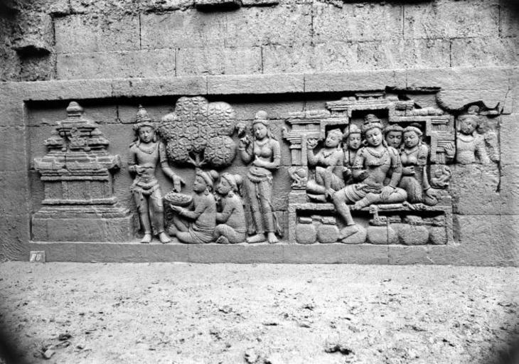| Keywords: COLLECTIE TROPENMUSEUM Reliëf O 140 op de verborgen voet van de Borobudur TMnr 10021585.jpg nl Negatief Negatief waarop reliëf O 140 van de verborgen voet van de Borobudur te zien is De verborgen voet van de Borobudur is de oorspronkelijke basis van het Buddhistische heiligdom dat rond 800 gebouwd is In een latere fase van de bouw werd deze basis verborgen waarschijnlijk om verzakking te verkomen De verborgen voet loopt om het hele bouwwerk heen en bevat 160 reliëfs die tezamen de Mahakarmawibhangga verbeelden een Mahayanistische tekst die de werking van de leer van Karma uiteenzet Deze leerrede wordt aan Buddha toegeschreven en handelt over oorzaak en gevolg N J Krom en Th van Erp duiden in hun standaardwerk over de Borobudur Beschrijving van Barabudur Den Haag Martinus Nijhoff 1920-1931 de reliëfs van de verborgen voet aan als serie O Op de reliëfs zijn voorbeelden van de theorie uitgebeeld goede daden hebben goede gevolgen en slechte daden hebben slechte gevolgen De reliëfs vallen in twee delen uiteen O 1 tot en met O 117 verbeelden een aantal daden die leiden tot één en hetzelfde gevolg De reliëfs O 118 tot en met O 160 tonen verschillende gevolgen van één oorzaak De uiteenzetting van de leer begint bij de trap aan de oostzijde en ontrolt zich met de klok mee om het bouwwerk heen De reliëfs moeten dan ook gelezen worden van rechts naar links Lange tijd was onbekend wat op de reliëfs van de verborgen voet stond afgebeeld Hoewel de reliëfs al in 1885 waren ontdekt door Dr Ir J W IJzerman 1851-1932 kon de Franse geleerde Sylvain Lévi pas in 1929 op het zesde Congres van het Oostersch Genootschap constateren dat het op de verborgen voet ging om een Buddhistische tekst Mahakarmawibhangga Lévi had in 1922 een manuscript uit 1411 met deze tekst ontdekt in Kathmandu Nepal De tekst bleek populair in de Burdhistische wereld te zijn en een aantal verwante teksten te hebben twee Chinese werken waarvan één vertaald was in 582 door Gautama Dharmaprajna en één tussen 980 en 1000 door T'ien si Tsai Daarnaast bevat de Tibetaanse Kanjur twee werken met de titel Karmawibhangga In 1933 publiceerde de archeoloog N J Krom een uitgebreide analyse van het Mahakarmawibhangga op de reliëfs van de bedolven voet Hierin legt hij een relatie tussen de afbeeldingen op de reliëfs en de tekstpassages in het Mahakarmawibhangga Reliëf O 140 bevindt zich aan de noordzijde van de Borobudur en heeft volgens N J Krom betrekking op paragraaf 68 van het Mahakarmawibhangga LXVIII Welke zijn de tien voordelen van de gift van vaatwerk Antwoord men wordt een vat van deugden; men wordt glad van denkvermogen; men lijdt niet veel dorst; als men dorst heeft verschijnt er water; men wordt niet herboren bij preta's; men heeft nooit gebrek aan vaatwerk; men heeft een rijke positie; men wordt herboren in de hemels; men bereikt spoedig het Parinirwana Dit zijn de tien voordelen van de gift van vaatwerk Deze paragraaf heeft betrekking op reliëfs O 138 tot en met O 140 Boven O 138a staat een inscriptie waarvan slechts het einde te lezen is 'dana' Op het reliëf staan staande en knielende personen afgebeeld die schalen aanbieden aan drie personen onder een afdak Op het volgende tafereel op O 138b bezoeken vier mannen vier hoger geplaatste monniken Hier staat de inscriptie 'kusaladharmabhajana' vaten van voortreffelijke eigenschappen wat overeenkomt met de vaten van deugden in de tekst Reliëf O 139 bevat één tafereel van een rijke man met kostbaarheden onder zijn zetel en zijn talrijke gevolg De inscriptie luidt 'bhogi' rijk gefortuneerd Op O 140a zien we een aanzienlijke rijke man met zijn vrouwen in een paviljoen Op O 140b zien we een rijke man naast een heiligdom De inscriptie 'swargga' geeft aan dat het om een hemel gaat ook al ontbreken hier de hemelboom de juwelenpotten en de kinnara's half mens half vogel die normaliter een hemel aanduiden Uit N J Krom Het Karmawibhangga op Barabudur Mededeelingen der koninklijke academie van wetenschappen afdeeling letterkunde deel 76 serie B No 8 Amsterdam Noordhollandsche Uitgevers-Maatschappij 1933 263-264 Bronnen A J Bernet Kempers Borobudur Mysteriegebeuren in steen Verval en restauratie Oudjavaans volksleven Wassenaar 1973/gewijzigde herdruk ; Van Erp Th Krom N J Beschrijving van Barabudur Den Haag Martinus Nijhoff 1920-1931 ; N J Krom Het Karmawibhangga op Barabudur Mededeelingen der koninklijke academie van wetenschappen afdeeling letterkunde deel 76 serie B No 8 Amsterdam Noordhollandsche Uitgevers-Maatschappij 1933 Reliëf O 140 op de verborgen voet van de Borobudur 1890-1891 institution Tropenmuseum KIT-source 10021585 Creator Kassian Cephas Borobudur in 1890 Black and white photographs |