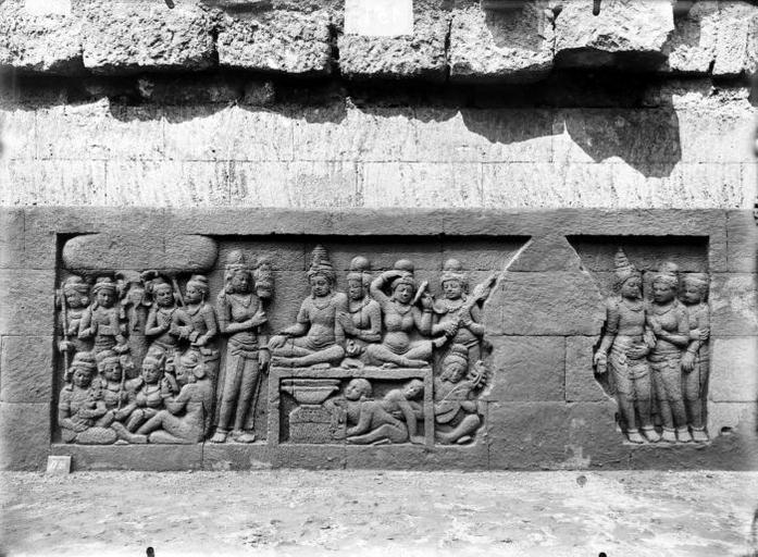 | Keywords: COLLECTIE TROPENMUSEUM Reliëf O 151 op de verborgen voet van de Borobudur TMnr 10015887.jpg nl Negatief Negatief waarop reliëf O 151 van de verborgen voet van de Borobudur te zien is De verborgen voet van de Borobudur is de oorspronkelijke basis van het Buddhistische heiligdom dat rond 800 gebouwd is In een latere fase van de bouw werd deze basis verborgen waarschijnlijk om verzakking te verkomen De verborgen voet loopt om het hele bouwwerk heen en bevat 160 reliëfs die tezamen de Mahakarmawibhangga verbeelden een Mahayanistische tekst die de werking van de leer van Karma uiteenzet Deze leerrede wordt aan Buddha toegeschreven en handelt over oorzaak en gevolg N J Krom en Th van Erp duiden in hun standaardwerk over de Borobudur Beschrijving van Barabudur Den Haag Martinus Nijhoff 1920-1931 de reliëfs van de verborgen voet aan als serie O Op de reliëfs zijn voorbeelden van de theorie uitgebeeld goede daden hebben goede gevolgen en slechte daden hebben slechte gevolgen De reliëfs vallen in twee delen uiteen O 1 tot en met O 117 verbeelden een aantal daden die leiden tot één en hetzelfde gevolg De reliëfs O 118 tot en met O 160 tonen verschillende gevolgen van één oorzaak De uiteenzetting van de leer begint bij de trap aan de oostzijde en ontrolt zich met de klok mee om het bouwwerk heen De reliëfs moeten dan ook gelezen worden van rechts naar links Lange tijd was onbekend wat op de reliëfs van de verborgen voet stond afgebeeld Hoewel de reliëfs al in 1885 waren ontdekt door Dr Ir J W IJzerman 1851-1932 kon de Franse geleerde Sylvain Lévi pas in 1929 op het zesde Congres van het Oostersch Genootschap constateren dat het op de verborgen voet ging om een Buddhistische tekst Mahakarmawibhangga Lévi had in 1922 een manuscript uit 1411 met deze tekst ontdekt in Kathmandu Nepal De tekst bleek populair in de Burdhistische wereld te zijn en een aantal verwante teksten te hebben twee Chinese werken waarvan één vertaald was in 582 door Gautama Dharmaprajna en één tussen 980 en 1000 door T'ien si Tsai Daarnaast bevat de Tibetaanse Kanjur twee werken met de titel Karmawibhangga In 1933 publiceerde de archeoloog N J Krom een uitgebreide analyse van het Mahakarmawibhangga op de reliëfs van de bedolven voet Hierin legt hij een relatie tussen de afbeeldingen op de reliëfs en de tekstpassages in het Mahakarmawibhangga Reliëf O 151 bevindt zich aan de oostzijde van de Borobudur en heeft volgens N J Krom betrekking op paragraaf 70 van het Mahakarmawibhangga LXX Welke zijn de tien goede eigenschappen van het geven van een vervoermiddel Antwoord men heeft kleine welgevormde voeten; men staat stevig op zijn voeten men wordt niet moe van de weg; men heeft niet veel vijanden; men verkrijgt herhaaldelijk magische kracht; men heeft geen gebrek aan vervoermiddelen olifanten paarden enz ; men heeft een rijke positie; men wordt herboren in de hemels; men bereikt spoedig het Parinirwana Zoals enz Dit zijn de tien goede eigenschappen van het geven van een vervoermiddel Deze paragraaf heeft betrekking op reliëfs O 150 en O 151 Op O 150a zien we zittende brahmanen in een paviljoen aan wie sandalen worden gegeven Erboven staat de inscriptie 'upanat' sandaal Op het volgende tafereel is de aankomst van een voornaam persoon in een draagstoel afgebeeld Daaraan vooraf gaan een paard en een olifant Volgens Krom gaat het hier om het voorstellen van het geen gebrek hebben aan vervoersmiddelen waarbij zowel de olifant als het paard uitdrukkelijk worden genoemd De inscriptie boven dit tafereel is niet duidelijk; volgens Krom staat er 'wahanawaikalya' of 'yanawaikalya' Op reliëf O 151 zien we wezens onder een boom maar het is onduidelijk of ze kinnara's half mens half vogel zijn De opzet van het tafereel geeft voldoende aan dat het gaat om een god met zijn gevolg De inscriptie 'swargga' hemel bevestigt dat Krom meent dat het waarschijnlijk is dat alles bij elkaar hoort en reliëf O 151 in zijn geheel een hemel weergeeft Uit N J Krom Het Karmawibhangga op Barabudur Mededeelingen der koninklijke academie van wetenschappen afdeeling letterkunde deel 76 serie B No 8 Amsterdam Noordhollandsche Uitgevers-Maatschappij 1933 267 Bronnen A J Bernet Kempers Borobudur Mysteriegebeuren in steen Verval en restauratie Oudjavaans volksleven Wassenaar 1973/gewijzigde herdruk ; Van Erp Th Krom N J Beschrijving van Barabudur Den Haag Martinus Nijhoff 1920-1931 ; N J Krom Het Karmawibhangga op Barabudur Mededeelingen der koninklijke academie van wetenschappen afdeeling letterkunde deel 76 serie B No 8 Amsterdam Noordhollandsche Uitgevers-Maatschappij 1933 Reliëf O 151 op de verborgen voet van de Borobudur 1890-1891 institution Tropenmuseum KIT-source 10015887 Creator Kassian Cephas Borobudur in 1890 Black and white photographs |