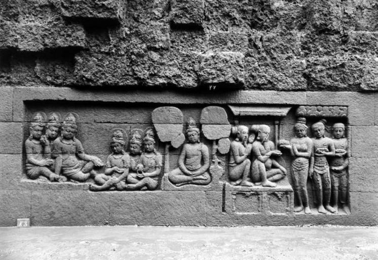 | Keywords: COLLECTIE TROPENMUSEUM Reliëf O 104 op de verborgen voet van de Borobudur TMnr 10015841.jpg nl Negatief Negatief waarop reliëf O 104 van de verborgen voet van de Borobudur te zien is De verborgen voet van de Borobudur is de oorspronkelijke basis van het Buddhistische heiligdom dat rond 800 gebouwd is In een latere fase van de bouw werd deze basis verborgen waarschijnlijk om verzakking te verkomen De verborgen voet loopt om het hele bouwwerk heen en bevat 160 reliëfs die tezamen de Mahakarmawibhangga verbeelden een Mahayanistische tekst die de werking van de leer van Karma uiteenzet Deze leerrede wordt aan Buddha toegeschreven en handelt over oorzaak en gevolg N J Krom en Th van Erp duiden in hun standaardwerk over de Borobudur Beschrijving van Barabudur Den Haag Martinus Nijhoff 1920-1931 de reliëfs van de verborgen voet aan als serie O Op de reliëfs zijn voorbeelden van de theorie uitgebeeld goede daden hebben goede gevolgen en slechte daden hebben slechte gevolgen De reliëfs vallen in twee delen uiteen O 1 tot en met O 117 verbeelden een aantal daden die leiden tot één en hetzelfde gevolg De reliëfs O 118 tot en met O 160 tonen verschillende gevolgen van één oorzaak De uiteenzetting van de leer begint bij de trap aan de oostzijde en ontrolt zich met de klok mee om het bouwwerk heen De reliëfs moeten dan ook gelezen worden van rechts naar links Lange tijd was onbekend wat op de reliëfs van de verborgen voet stond afgebeeld Hoewel de reliëfs al in 1885 waren ontdekt door Dr Ir J W IJzerman 1851-1932 kon de Franse geleerde Sylvain Lévi pas in 1929 op het zesde Congres van het Oostersch Genootschap constateren dat het op de verborgen voet ging om een Buddhistische tekst Mahakarmawibhangga Lévi had in 1922 een manuscript uit 1411 met deze tekst ontdekt in Kathmandu Nepal De tekst bleek populair in de Burdhistische wereld te zijn en een aantal verwante teksten te hebben twee Chinese werken waarvan één vertaald was in 582 door Gautama Dharmaprajna en één tussen 980 en 1000 door T'ien si Tsai Daarnaast bevat de Tibetaanse Kanjur twee werken met de titel Karmawibhangga In 1933 publiceerde de archeoloog N J Krom een uitgebreide analyse van het Mahakarmawibhangga op de reliëfs van de bedolven voet Hierin legt hij een relatie tussen de afbeeldingen op de reliëfs en de tekstpassages in het Mahakarmawibhangga De reliëfs O 101 tot en met O 108 bevinden zich aan de noordzijde van de Borobudur en hebben volgens N J Krom betrekking op de paragrafen twintig tot en met tweeëntwintig van het Mahakarmawibhangga XX Wat is de daad die een geboorte onder de goden van de sfeer der Begeerte ten gevolge heeft Antwoord de tien goede wegen van de daad goed ten einde gebracht Dat is de daad die een geboorte onder de goden van de sfeer der Begeerte ten gevolge heeft XXI Wat is de daad die een geboorte onder de goden van de sfeer van de Vorm ten gevolge heeft Antwoord de tien goede wegen van de daad goed ten einde gebracht goed eigen gemaakt en op de meest voortreffelijke wijze vervolmaakt Dat is de daad die een geboorte onder de goden van de sfeer van de Vorm ten gevolge heeft XXII Wat is de daad die een geboorte onder de goden van de Vormloze sfeer ten gevolge heeft Antwoord de vier instellingen der meditatie van het vormloze de categorie van de oneindigheid van de ruimte de categorie van de oneindigheid van de kennis de categorie van de oneindigheid van het niet de categorie van inzicht en niet-niet-inzicht; deze instellingen van meditatie worden toegepast en vermenigvuldigd Dat is de daad die een geboorte onder de goden van de Vormloze sfeer ten gevolge heeft Op O 101 en O 102 treffen wij hemelvoorstellingen aan Hemelvoorstellingen worden gekarakteriseerd door wensbomen potten vol kostbaarheden onderaan de stam en door twee kinnara's wezens die half mens half vogel zijn Ook op andere plaatsen op het monument worden deze symbolen gebruikt om de hemel voor te stellen Hemeltaferelen worden soms door de inscriptie 'swargga' aangeduid De staande figuren van O 101b en de zittende met aureool op O 102b bevinden zich in een hemel De oorzaak daarvan vinden we op O 101a de aanbieding van een gift aan een brahmaan Op O 102a zien we een predikende monnik en een uitdeling aan behoeftigen Op de linkertaferelen ontbreken de kinnara's en de hemelbomen maar het lijkt Krom niet onwaarschijnlijk dat hier ook een hemel bedoeld is we zien op O 103c naast een paleis of een tempel een persoon in groot ornaat tussen vrouwen die hem dienen De groep op O 104c is voorzien van aureolen O 104 a en op O 104b tonen een predikende monnik en een uitdeling Op 104a is een gift van geschenken afgebeeld aan brahmanen Op 104b zit een mediterende persoon tussen twee onafgewerkte bomen Volgens Krom is het aannemelijk dat de beeldhouwer de hemelboom met kinnara's gereserveerd heeft voor de Kamawacara-goden Hieruit volgt dat O 101 en O 102 bij paragraaf XX horen en de hemels van O 103 en O 104 bij de goden van Rupawacara van XXI De grote moeilijkheid komt dan bij de goden van Arupyawacara van XXII want het lijkt Krom uitgesloten dat deze wezens weergegeven kunnen worden in een vorm; men mag ze zelfs helemaal niet verwachten op reliëfs Maar Krom meent dat op O 105 een poging is gedaan om aan te geven om de staat van vormeloosheid te bereiken; de vier monniken die ieder in een afzonderlijke rotsnis zitten te mediteren zouden de vier samapatti's van de tekst vertegenwoordigen Op reliëf O 106 is de hoofdpersoon in groot ornaat afgebeeld met een aureool achter het hoofd Achter zijn dienaren staat op het midden van het reliëf een boom; niet de gestileerde hemelboom maar wel met de juwelenpotten aan de voet O 106a geeft een huldebetuiging weer onder andere met een tros bananen van een aantal monniken De hoofdpersoon van O 107b heeft geen aureool maar draagt wel groot ornaat Ook hier staan juwelenpotten O 107a toont een uitdeling van onder meer kleding Reliëf O 108 begint met het geven van geschenken door rijk geklede perso