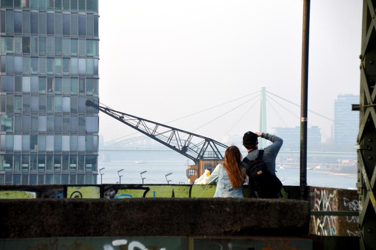 Keywords: cologne bridge crane homes love pair forward distant outlook longing railway weathered railway tracks crane