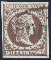 | Keywords: Colombia 1877 Sc74R.jpg  en Colombia 10c brown Bogus cancel 'BOG OTA ' Catalogue Sc 74 Reprint Counterfeit Much worn impression letters 'tavos' of 'centavos' touch date Scan of original author PD-old-100 Counterfeit stamps of Colombia Brown stamps |