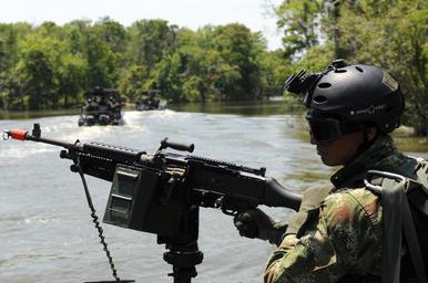 | Keywords: Colombian marine.JPG  Juan Melo a Colombian marine and student in the Patrol Craft Officer course at Stennis Space Center Miss participates in a field training exercise June 30 2009 The course is at the U S Naval Small Craft Instruction and Technical Training School Melo is a student in The Western Hemisphere Institute for Security Cooperation The mission of Naval Small Craft Instruction and Technical Training School is to provide partner nation security forces with the highest level of riverine and littoral craft operations and maintenance technical training The Western Hemisphere Institute for Security Cooperation focuses on providing professional education and training to eligible persons of the nations of the Western Hemisphere within the context of the democratic principles set forth in the Charter of the Organization of American States http //www defenseimagery mil/imagery html guid 0fa94607e98d17f395f1abf5176cc1af44f78492 U S Navy photo by Mass Communication Specialist R J Stratchko/Released 2009-06-30 PD-USGov Colombian Naval Infantry M-240 machine gun Magazines with cartridge belt Blank-firing adaptor |