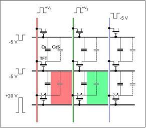 | Keywords: Color TFT-LCD Cells-Schematic.png Schéma électrique équivalent des cellules TFT d'un écran à cristaux liquides TFT-LCD où la pixel inférieur est allumé en jaune / Equivalent electric schematic of a TFT array in a LCD display A yellow pixel is lit by polarising R and B sub-pixels of the bottom pixel Les lignes horizontales commandes les grilles des transistors à effet de champ; les lignes verticales pilotent les sources / Horizontal lines drive the gates of the field-effect transistors FET while vertical ones command gray level through the sources Cs Capacité de stockage du sous-pixel / subpixel storage capacitance Cgs Capacité parasite entre l'électrode du sous-pixel et l'électrode avant / parasitic capacitance between cell electrode and front electrode Comments are welcome Image talk Color TFT-LCD Cells-Schematic png Commentaires bienvenus 2005-12-05 own assumed Lozère schematic drawings of LCDs TFT circuits |