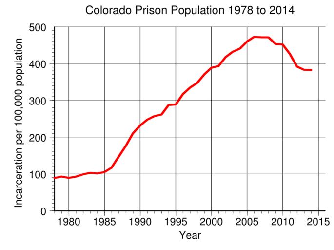 | Keywords: Colorado Prison Population.svg en Colorado prison incarceration rate per 100 000 population from 1978 to 2014 Data from http //www bjs gov/index cfm ty nps BJS 2016-05-11 own Delphi234 other versions current annually Generated with Wikimedia SVG Chart SVG Chart/box cc-zero Prisons in Colorado Imprisonment and detention rates in the United States |